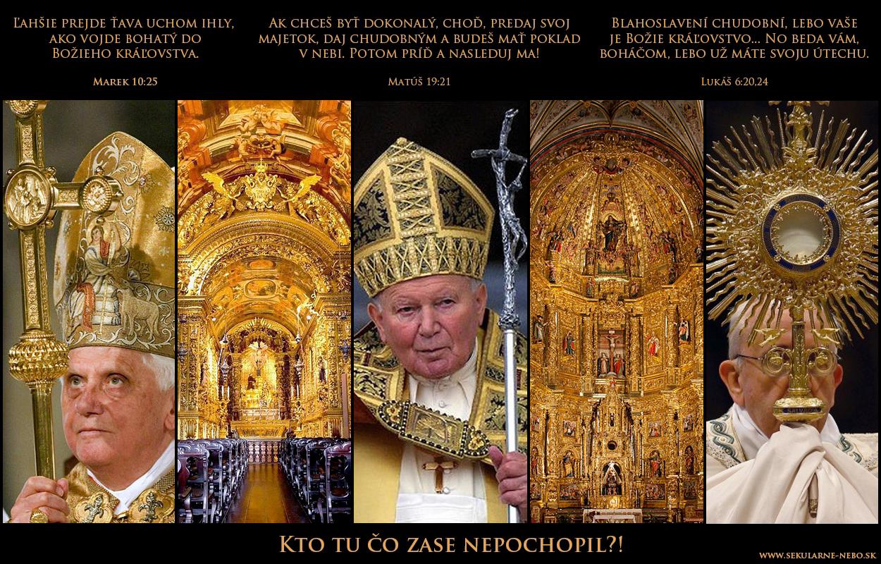 Každopádne všetky tie zlaté výzdoby kostolov, bohoslužobných predmetov a pod. sú jednak (na rozdiel od trebárs Trumpa a arabských šejkov) skôr historická záležitosť a dvak pomoc chudobným a trpiacim je len sekundárna činnosť Cirkvi; primárna je úcta k a chvála Boha, k čomu určitá honosnosť chrámov patrí (nielen u katolíkov!).