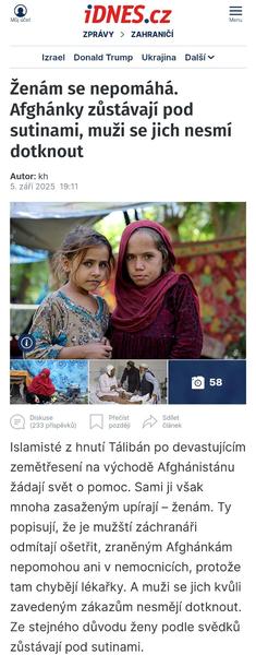 @bielasovicka Ty popisují, že je mužští záchranáři odmítají ošetřit, zraněným Afghánkám nepomohou ani v nemocnicích, protože tam chybějí lékařky. A muži se jich kvůli zavedeným zákazům nesmějí dotknout. Ze stejného důvodu ženy podle svědků zůstávají pod sutinami.