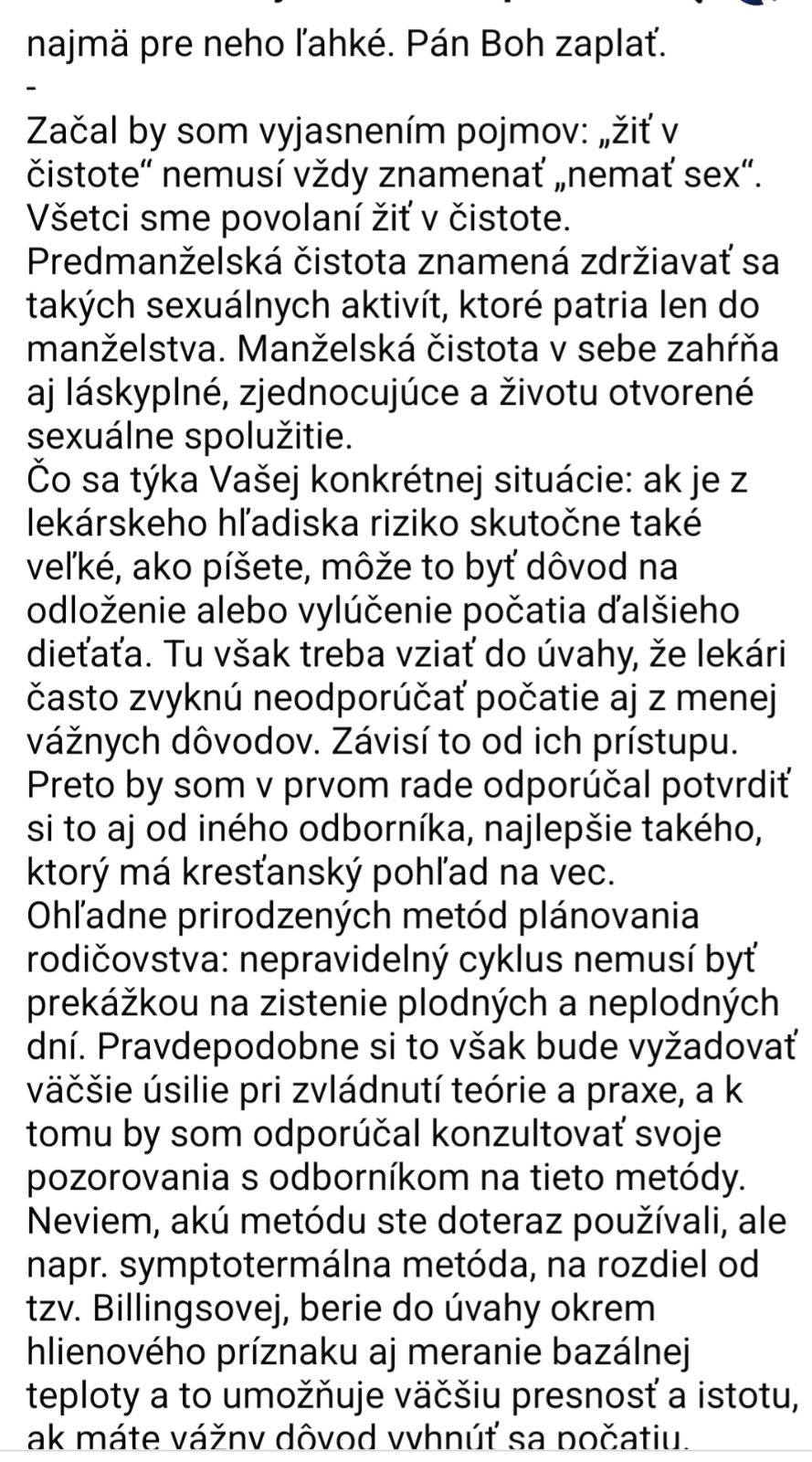 Poslednú dobu s manzelom riešime ako spolu sexualne žiť. Máme jedného syna ma 3 roky. Priznám sa, že si neviem predstaviť mať ďalšie deti. Ja niesom moc rodičovský typ ( ANO SU AJ TAKE ZENY) ale samozrejme svojho syna milujem. Je pravda, že čo sa týka sexuálneho života v našom manželstve, tak nepocitam si plodné a neplodne dni proste to mame prerusovane. ( Dopredu sa ospravedlňujem za detaily ale bez toho to pochopit nejde) Boli sme na spovedi a ja to vzdy poviem na spovedi... Nikdy mi k tomu knaz nic nepovie ... Od spovede sme boli raz v kostole potom o par dni sme mali styk po našom... Ja si proste neviem predstaviť ze musim mat s vlastným manzelom sex len ako podľa tabuľky a priznám sa, že co sa týka plodnych dni tak som si to nikdy nepocitala ... Môžem ísť vobec na ďalšie prijimanie? Neviem čo robiť. Je pravda ze toto som sa dozvedela az po našej svadbe , že manzelia si majú počítať tie dni. Preco o tom nehovoria normalne knazi? Poznam ľudí, ktorý o tom vazne NEVEDELI ze sa to takto smie a nesmie. Vzdy som si povedala no už keď sa vezmeme budeme môcť bez vycitiek žiť spolu sexuálne. A bum co sa nedozviem, že chránený, prerušovaný sex je aj v manželstve hriech 🤦 a aj to som sa dozvedela len dakde v článku... Ako sa poznam, druhe a ďalšie tehotenstvo by som znášala ťažko hlavne psychický... Syna sme planovali ale ďalšie dieta si nevieme predstaviť... Viem ze je aj nejaký pristroj ktorý nestoji male peniaze, na zistenie plodnych a neplodnych dni 😐 ale nakolko je to presne? Príde mi to proste prilis odveci aby som so svojim manzelom nemohla zit sexualne tak ako chceme my. Nie každý je na dalsie dieta pripraveny... Ved to nieje zviera ktore ked nechcem dam do utulku... Ja sa nesnažím najst obkluku lebo podla katolickej cirvi taka obkluka neexistuje... Iba pocitanie tych dni. Ale kto mi zaručí ze to je 100% a ďalšia vec ved aj umyselne pocitanie tych dni je vlastne vedome zabranenie pocatiu nie? Uz som z toho vsetkeho mimo. A hlavne co mam robit ci ist na prijimanie alebo nie... Ved som si svojho manzela vzala pred Bohom nepodvadzame sa milujeme sa nechodim od chlapa k chlapovi, co by bol hriech ale ze este aj toto... Ďakujem za vaše názory, odpovede, prosím aby sme sa v diskusii neurazali a neposudzovali sa...