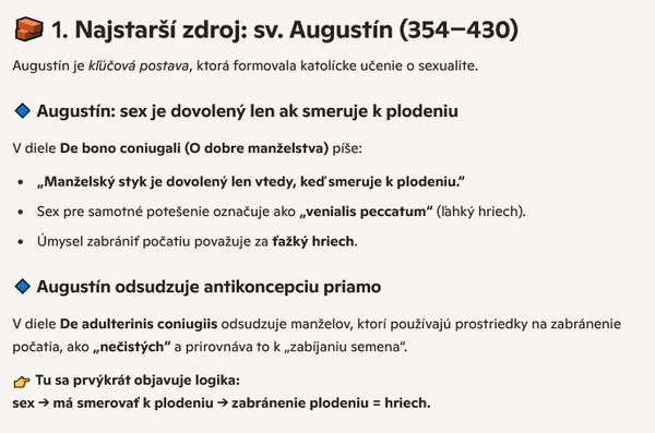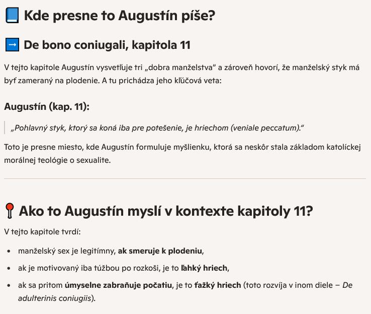 @anonym_2cb318 Áno, je to pravda. Sv. Augustín sa nad týmto zamýšľal, jeho myšlienky sa dlho uznávali, ale aj sa opakovane prehodnocovali. Jeho myšlienka, že by bol sexuálny akt v manželstve nejakým hriechom, sa časom zavrhla. Manželský akt intímneho spojenia vyjadruje fyzické potvrdzovanie zmluvy, ktorú manželia uzavreli v duchovnej rovine, že budú dvaja jedným telom. Preto sa manželia majú stýkať aj pre upevnenie manželského vzťahu, nielen za účelom plodenia detí, ale to spojenie má byť v celosti.