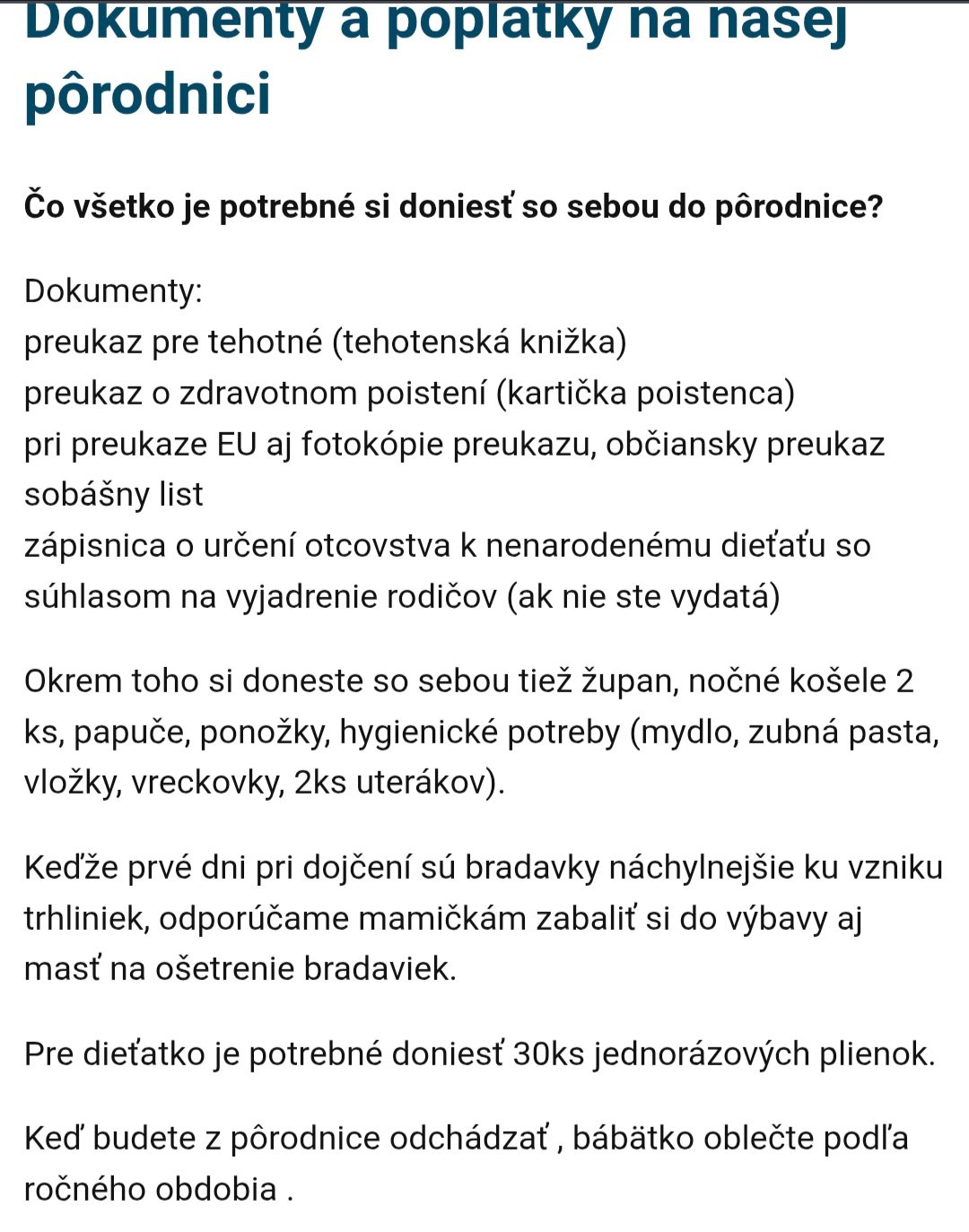 Všetko pre bábätko je tam. Okrem plienok, čo máš mať vlastné a vlhčené utierky. Pre seba ako maminku si musíš doniesť všetko. Popôrodné vložky, podložku nepremokovavu- tu chceli od mňa aj na pôrodnej sále, a šľapky do sprchy určite. Nohavičky sú tiež skvelá vec- sieťované a zober si aj vložky do podprsenky. Toaletný som mala tiež svoj, nám doniesli do WC až na tretí deň. A cez víkend nedoplnali.