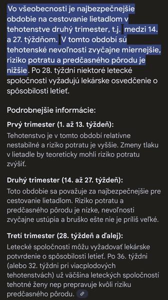@derna no podla toho ci ti byva zle pri lietani lebo mne vobec. Vplyv na tehotenstvo by to nemalo mat ziaden, ani na babatko, toho sa obavat nemusis. Su rozne konspiracie na nete ktore nie su potvrdene ani lekarmi, takze to mozes byt v klude. Vplyva to skor na matku ako na dieta, zvyknu puchnut nohy, preto su dolezite kompresne pancusky. Ale ak ti byva zle aj ked nie si tehotna, tak neviem neviem. Ty vies ci to zmaknes, ale predsa len stres robi svoje aj ked nie si tehotna.😁