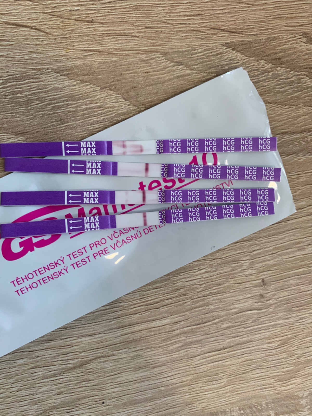 Dievčatá viete mi poradiť. GS mama test. Prvá fotka robené včera. Pekne čiarky. Začala som jemne špiniť asi hodinku včera a hodinku dnes takze som si dala utrogestan a dnes ráno spravila ďalšie testy. Rovnaký odobraný moc do nádobky a testy takto. Zo 4 - 2 krásne pozitívne a 2 total nič. Ja neviem či sa to somnou hra alebo čo