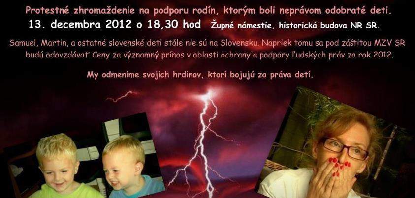 Protest na podporu rodín, ktorým boli neprávom odobraté deti. Ktorým boli odňaté ľudské práva a porušené práva dieťaťa. Vyjadrenie nesúhlasu voči oceňovaniu za prínos pre ochranu ľudských práv osobám, ktoré sa o ich ochranu v praxi vôbec nepričinili.
