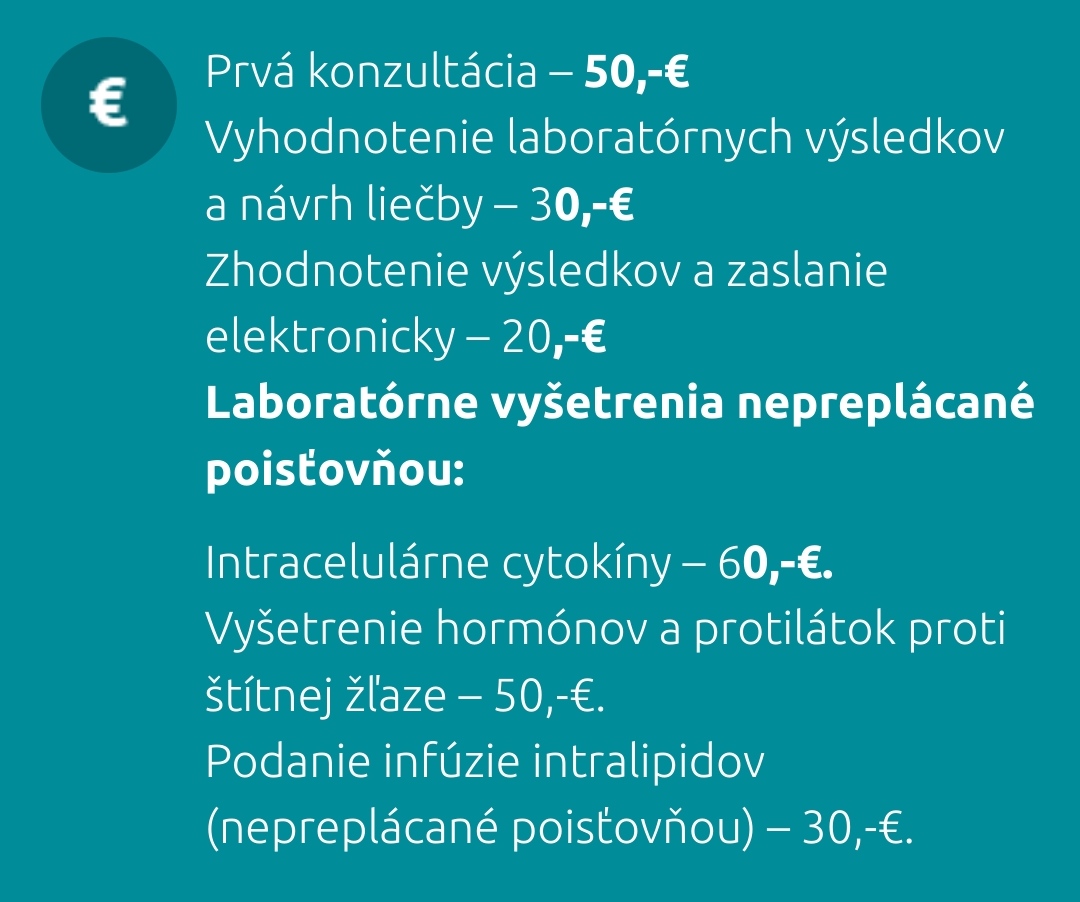 Keď pozerám na tie úkony, tak som platila cca 140€ prvý krát. Prvá konzultácia je 50, výsledky 30 (prišla som osobne) a cytokiny 60. Štítnu žľazu nebolo treba lebo sa už liečim.