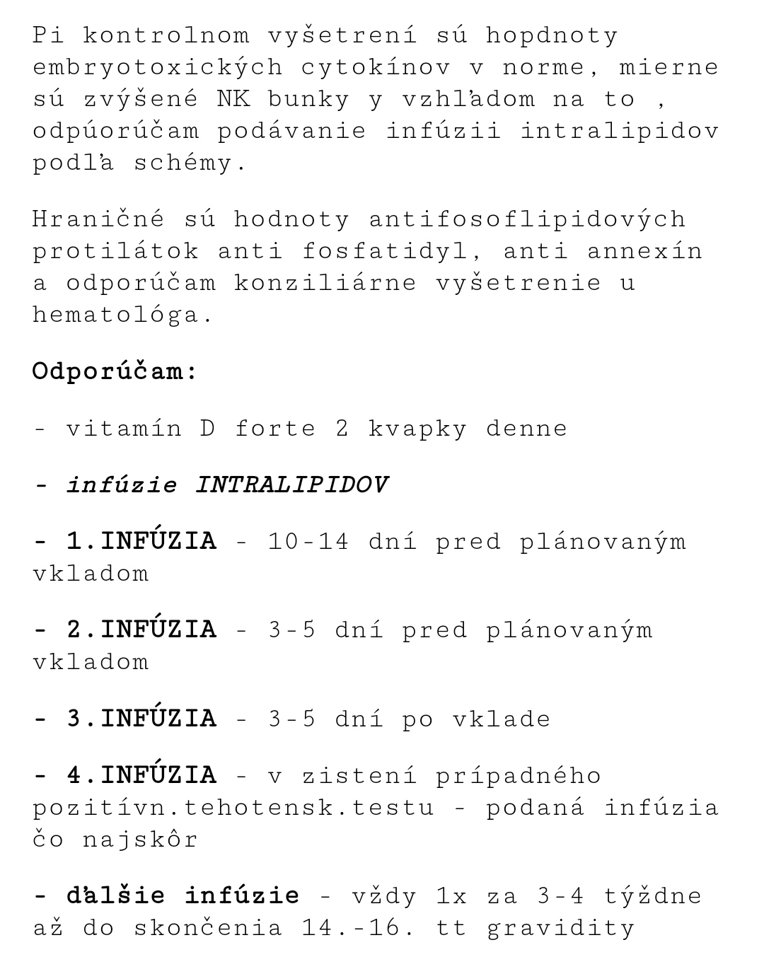 Synček už mal rok 🙂 intralipidy som brala podľa tejto schémy. Určite odporúčam reprodukčnú imunológiu...je tam toľko faktorov kde môže byť problém, až som z toho bola prekvapená... odtiaľ má odporučili na hematológiu lebo mi tam vyšli nejaké hraničné hodnoty. Na hemato sa potom nič nepotvrdilo, no dali mi preventívne anopyrin a ku koncu tehotenstva som si miesto neho pichala fragmin. Ešte k tomu aj Globifer Forte kvôli nedostatku železa. Ja som presvedčená o tom že práve táto kombinácia intralipidov a anopyrinu, vitamínu D nám pomohla.