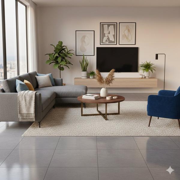 Nápady na zariadenie obývacej izby so sivou dlažbou