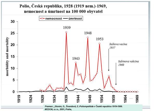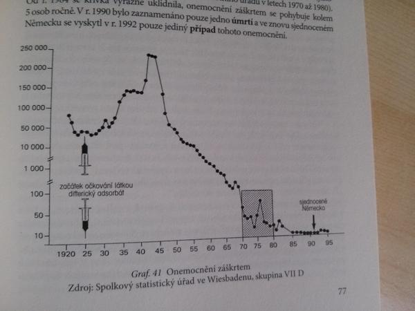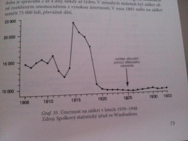 Ten graf, aky si dala ty, ma vo svojej knihe aj Buchwald (hovori o OCHORENI nie o UMRTI) a pise k nemu toto: Jake skody muze ockovani zpusobit - nejen ve vztahu k jednotlivci, ktery muze byt ockovanim poskozen, ale take ve vztahu k celkove situaci, tedy I v pripade ustupu epidemie - lze ukazat zretelne prave na pripadu zaskrtu. Na obr. 41 je videt pocatecni stejny prudky pokles, jako u vsech ostatnich infekcnych onemocneni. Pocet onemocneni zaskrtem klesl behem nekolika let od r. 1918 ca. z 100 000 na 25 000. V roce 1925 bylo zavedeno ockovani proti zaskrtu, ktere se intenzivne prpagovalo a caste se aplikovalo. (Moja poznamka, takze nevidim tu nic z tvojho tvrdenia "zaočkovanosť tam ani zďaleka nedosahovala potrebnú uroven na zastavenie šírenia choroby, to sa podarilo až po vojne,") Po te zacal kontinualne vzrustat pocet onemocneni. V roce 1945 bylo dosazeno vrcholu s 250 000 pripadu rocne, aby po skonceni valky doslo k prudkemu poklesu, nehlade na to, ze v povalecnych letech se bud neockovalo vubec nebo jen malo. Je zde opet videt, ze zivnou pudou pro infekcni onemocneni je bida, hlad a nouze, tak jak to bylo zrejme z krivek tykajicich se nestovic, tuberkulozy a cerneho kasle.