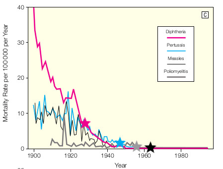 A keď už spomínaš USA, tu je graf vývoja úmrtnosti na záškrt, čierny kašeľ, osýpky a poliomyelitídu v USA. (Zdroj: Armstrong GL, Conn LA, Pinner RW. Trends in infectious disease mortality in the United States during the 20th century. JAMA. 1999 Jan 6;281(1):61-6. PMID: 9892452). Do grafu som pre lepší prehľad vniesol roky a zavedenie jednotlivých plošných očkovaní.