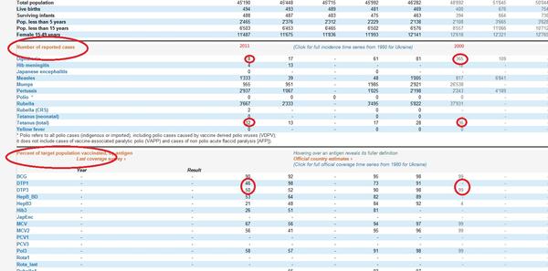 No neviem, či vidím dobre... v r.2000, zaočkovanosť proti tetanu 99%, reportovaných prípadov 36... tá istá vakcína, teda stále 99% zaočkovanosť, prípadov záškrtu 365 (v r2011 zaočkovanosť síce 46-50%, ale prípadov tetanu 12 a záškrtu 8...