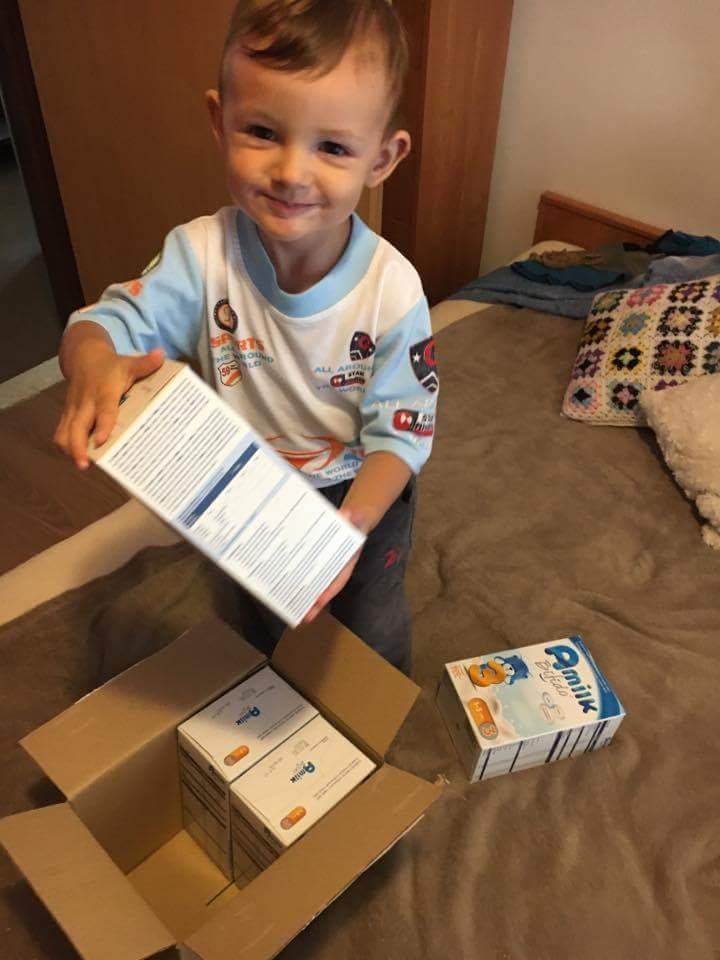 Domov nám ujo kurier doniesol štyri škatule. Keďže predtým pil Oliverko iné mliečko Amilk som zavádzala postupne. Najprv som zmiešala jeho pôvodne mlieko s Amilkom v pomere 1:1 a po dvoch dňoch sme prešli úplne na Amilk.