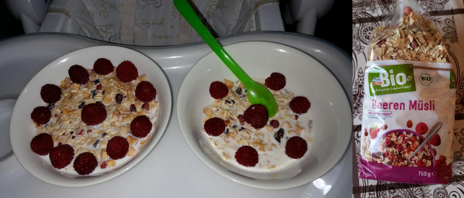 Ja s drobcom sme veľmi ocenili v balíčku Beeren Musli plné jahôdok, malín a celozrných vločiek. Pri zaliatí s teplým mliekom prešla úžasná vôňa sušeného bobuľového ovocia, vločky krásne zmäkli, doladili čerstvým ovocím - celoročnými malinami zo záhradky - a mohli sme mlsať.