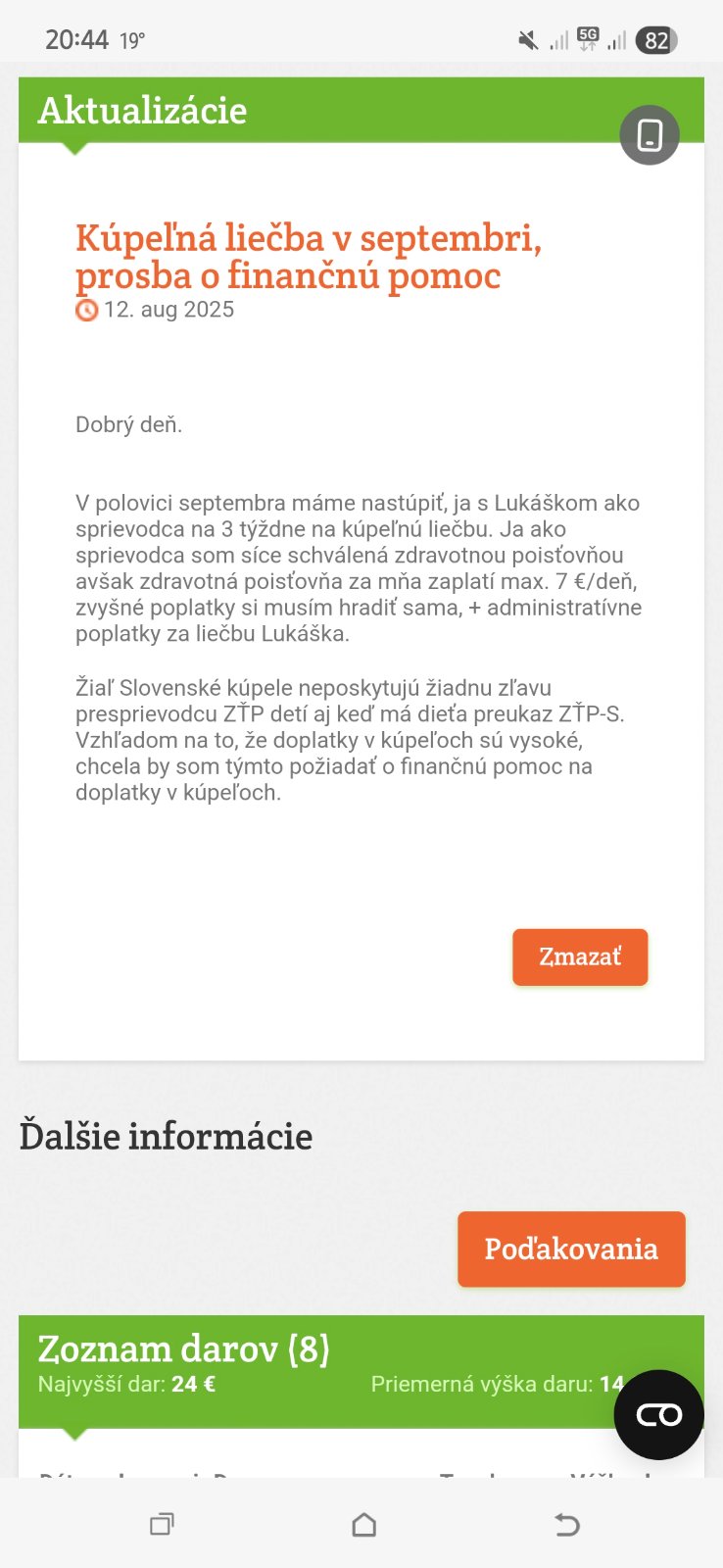 12.09. nastupujeme do kúpeľov na 3 týždne na kúpeľnú liečbu. Žiaľ kúpele neposkytujú žiadnu zľavu pre sprievodcu ZŤP detí aj keď má dieťa preukaz ZŤP-S. Doplatky majú byť v hodnote okolo 1000 eur. Žiaľ z Príspevku na opatrovanie si nemôžem dovoliť zaplatiť tak vysokú sumu. Preto prosím o finančnú pomoc.