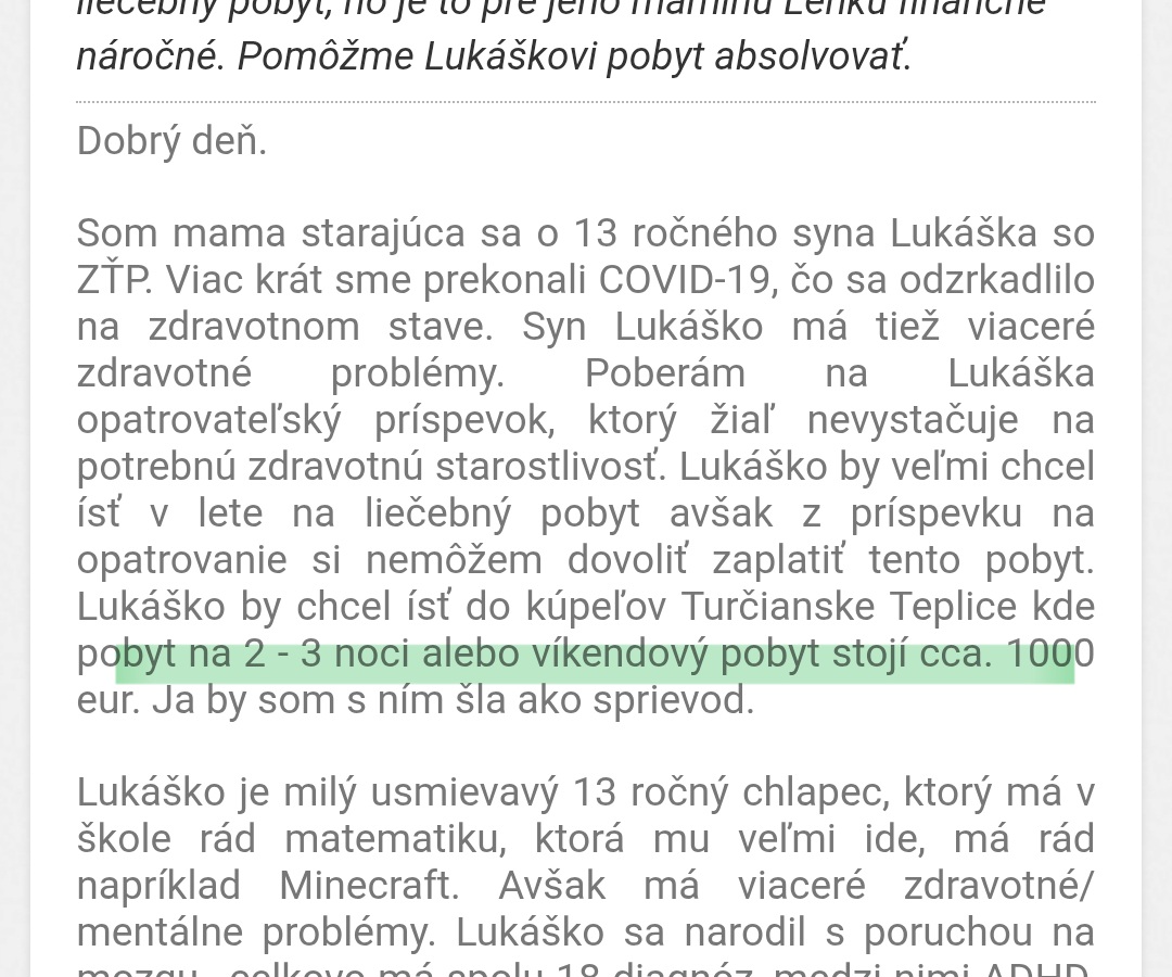 @aurelia2000 to čo je napísané vo výzve čo zvýraznil @hiro tak to bolo v júli. Lukáško chcel veľmi ísť do Turčianskych Teplic aby mal aspoň niečo z prázdnin. Pre vysoké výdavky, jednak strava, terapie, ktoré syn potrebuje, lieky ktoré užíva som si nemohla dovoliť zaplatiť ten krátky liečebný pobyt. Nakoniec sme na to mali príspevok od Nadácie