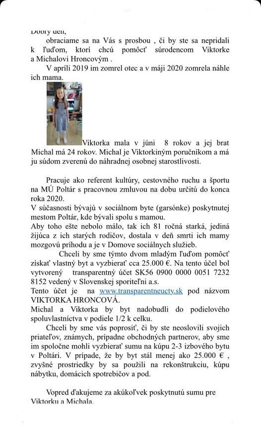 dovolila som si sem pridať zbierku pre dvoch súrodencov z Poltára. Ich smutný príbeh je v prílohe. Majú založený transparentný účet: