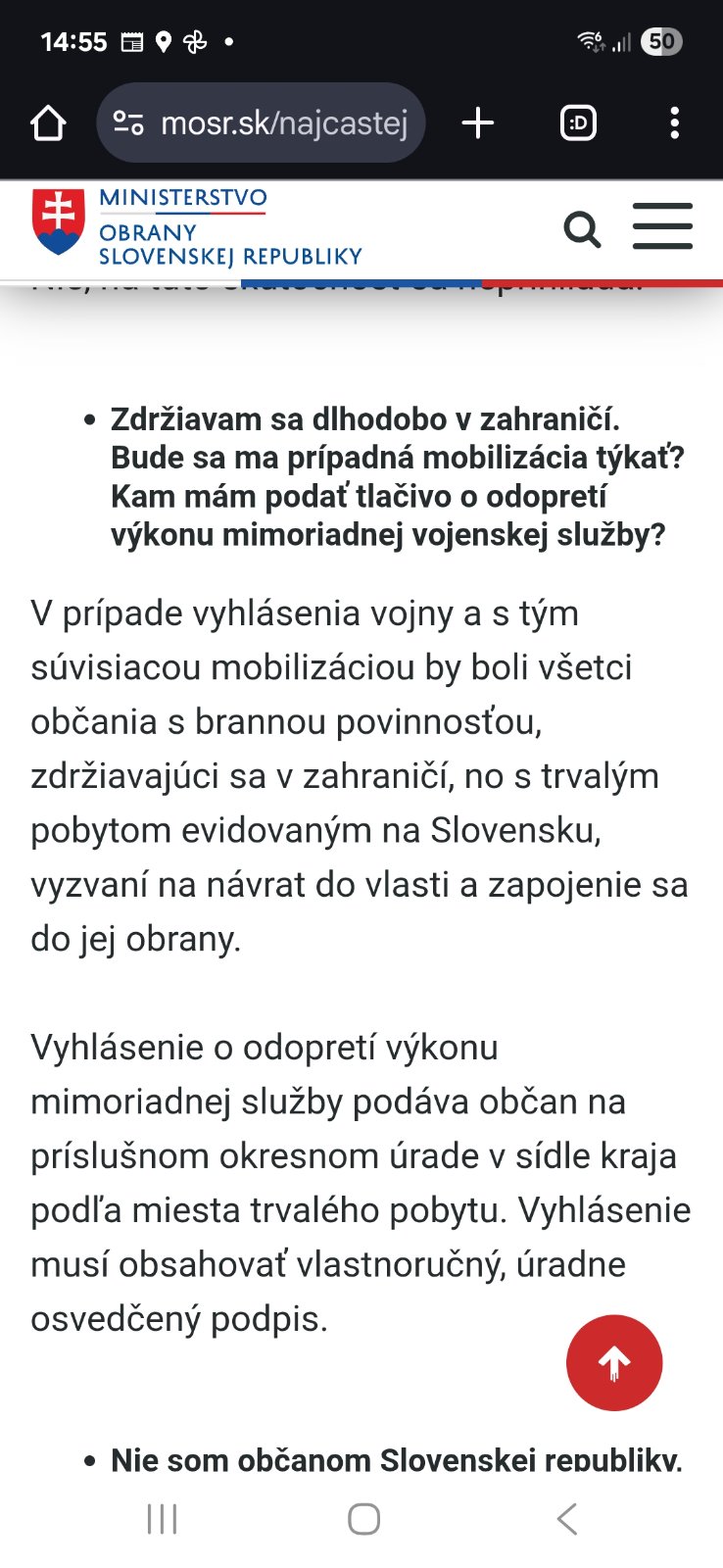 @anonym_autor Branná povinnosť a s ňou spojená prípadná mobilizácia nie je viazaná na trvalý pobyt, ale na štátne občianstvo. To znamená, že aj občan Slovenskej republiky žijúci v zahraničí môže byť v prípade potreby povolaný do ozbrojených síl, pokiaľ spĺňa vekové a zdravotné kritériá.
