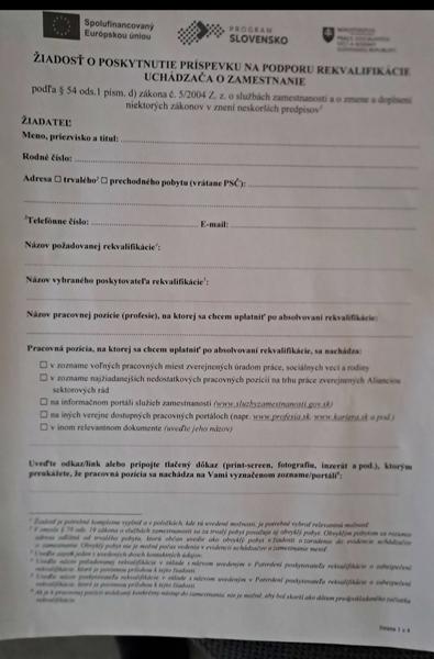 Nazov rekvalifikacie: opatrovatelsky kurz. Nazov vybraneho poskytovatela: UPSVaR. Nazov prac pozicie, kde sa chces uplatnit: opatrovatelka. Kde sa nachadza prac pozicia, kde sa chces uplatnit : zaciarkni viac policiek, lebo su to zdroje, kde sa uverejnuju volne pracovne miesta. Aj ked sa pomylis, z toho sa nestriela. Dolezite su osobne udaje, dalsie veci nik necita.