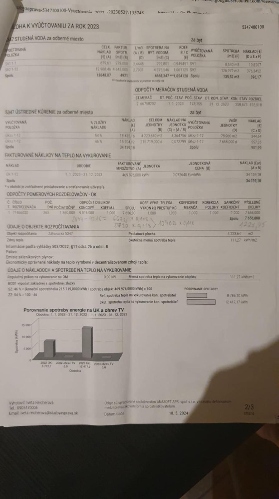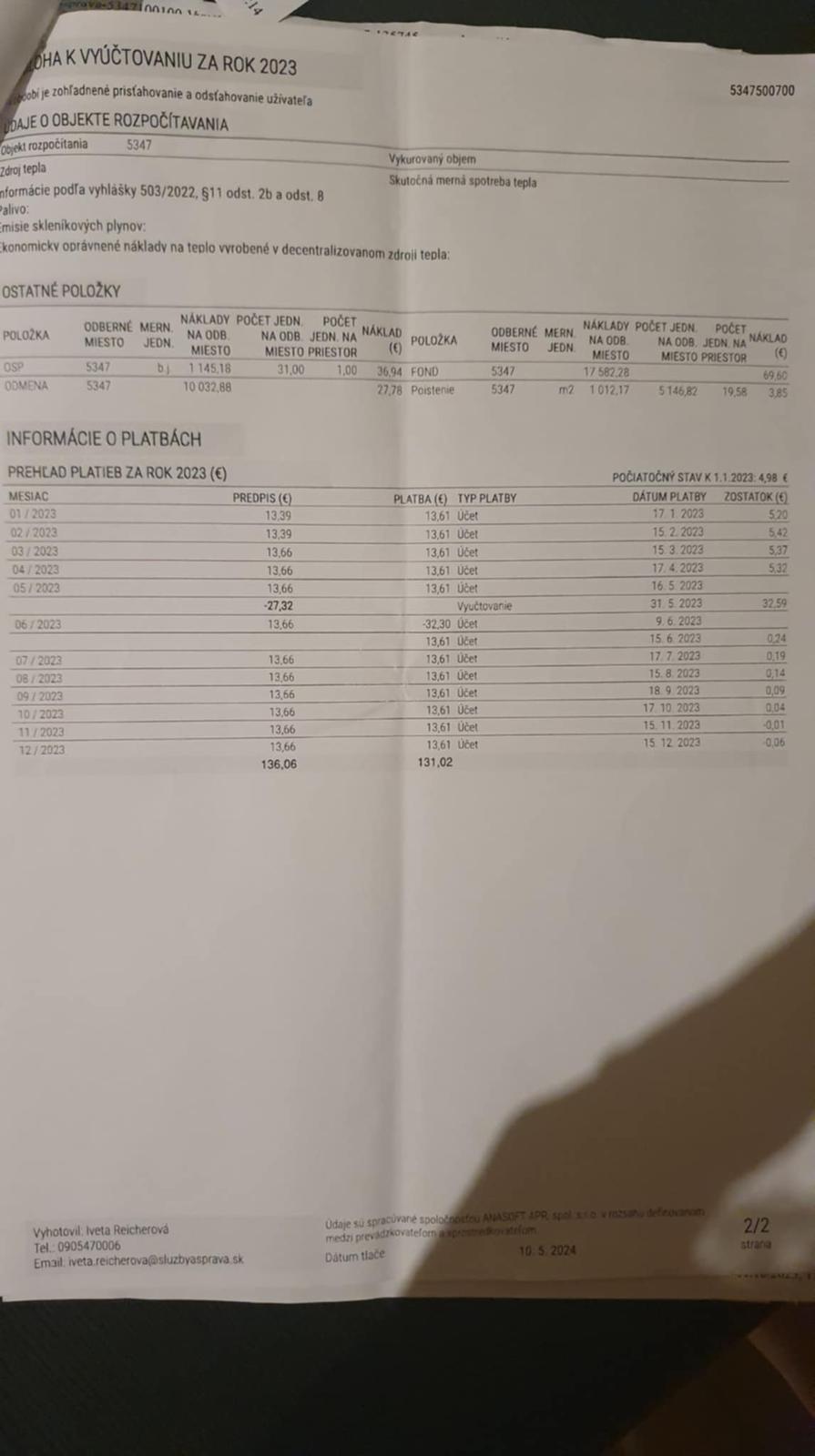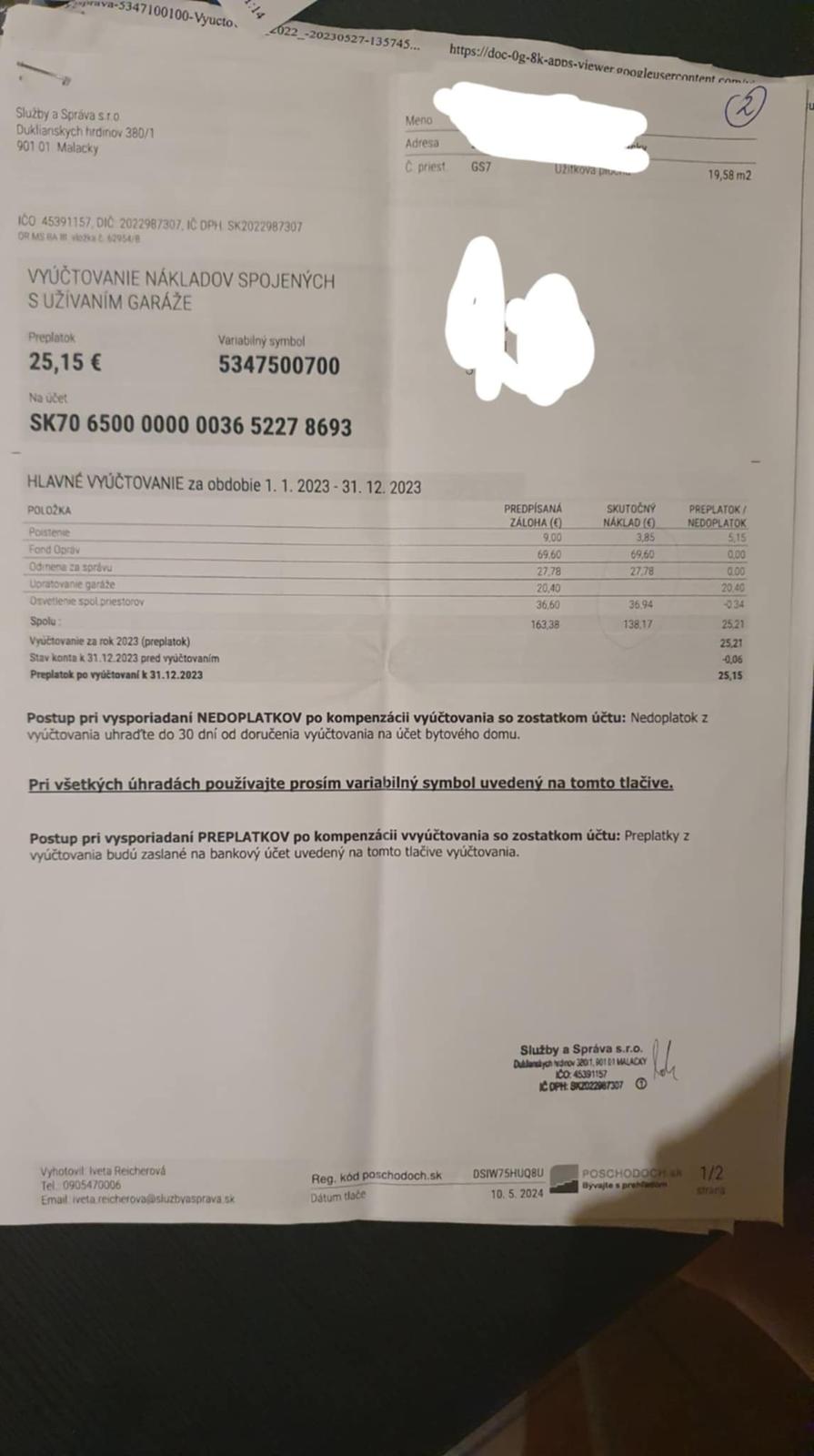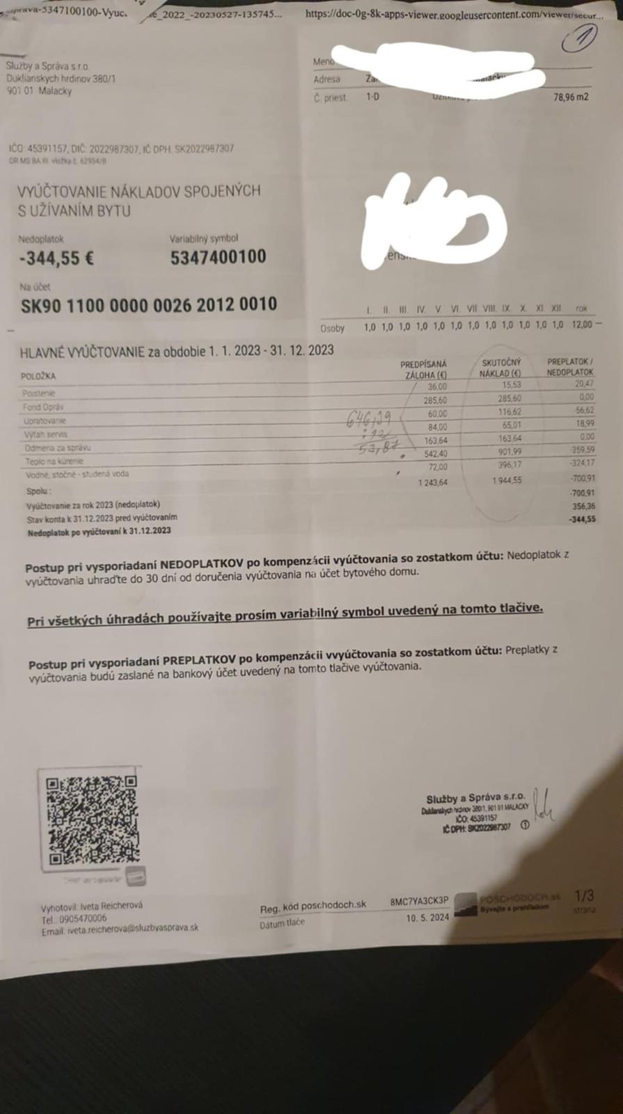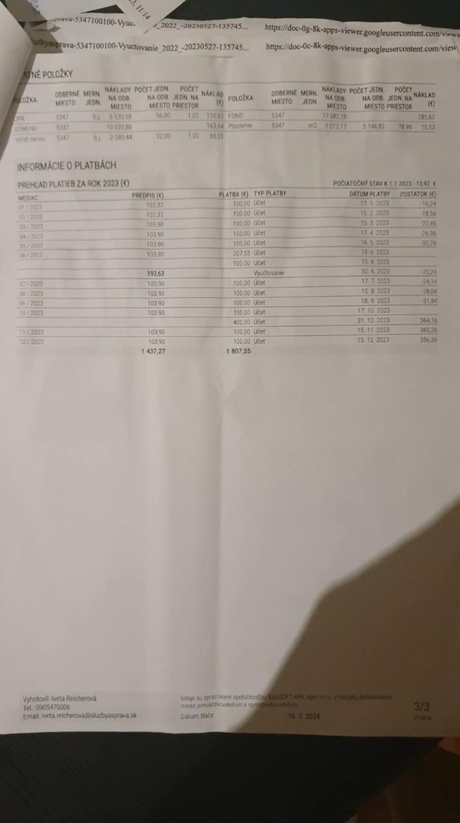 @autor. ...tak podme ratať spolu: napriklad rok 2023, to je 10 mesiacov ste tam boli: vy ste jej platili zalohy 200 eur/mesačne. (byt+garaž). Cize 200x10=2000 eur ste jej zaplatili za rok 2023. ....Ona zaplatila v roku 2023: za byt: 1600 eur (to je: marec+apríl+máj po 100eur kazdy mesiac, jún 307,55 eur, júl až september po 100 eur kazdy mesiac, oktober 500 eur november+december po 100 eur kazdy mesiac. TOTO SEDI, ano? to vidis na tom vyuctovani aj ty.