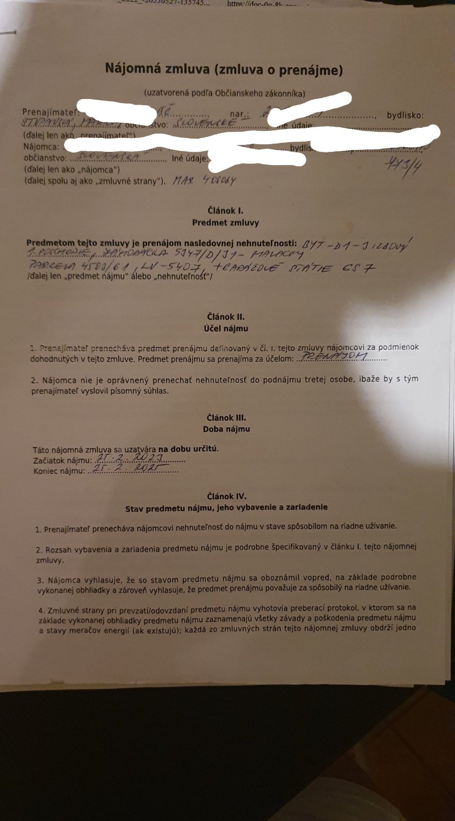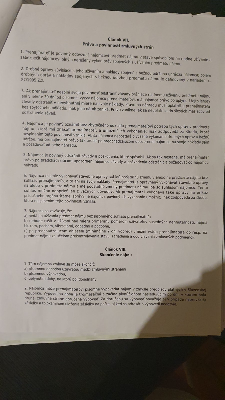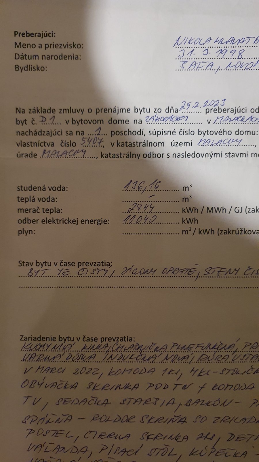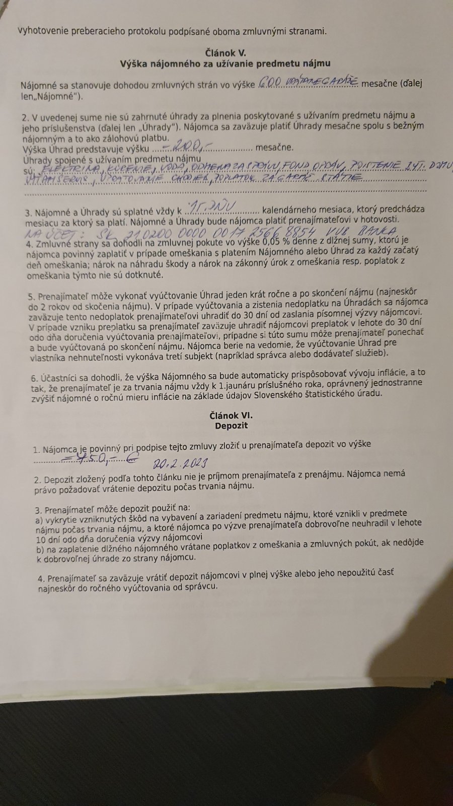 @pieksamaki no v zmluve pri podpisovani bolo zapisane studena voda,tepla voda, merač tepla,odber el.energie a pri odchadzani z bytu to iste. V zmluve je uvedene depozit 750€ a najom na ucet. Potom pri podpisovani zmluvy spomenula ze chce este jeden najom dopredu s cim sme nesuhlasili lebo v zmluve to nie je a ani v inzerate nebolo a ani pri obhliadke bytu nespomenula až pri podpisovaní. Ale pod tlakom sme jej dali aspon 400e lebo na rychlo a svoma detmi sme nemali ako riesit dalsie byvanie. Čiže to nie je nikde spomenuté ze ona chcela plus najom dopredu , je to slovo proti slovu.