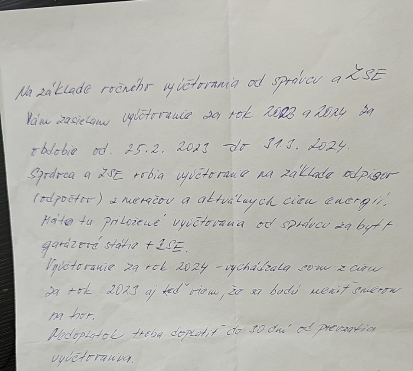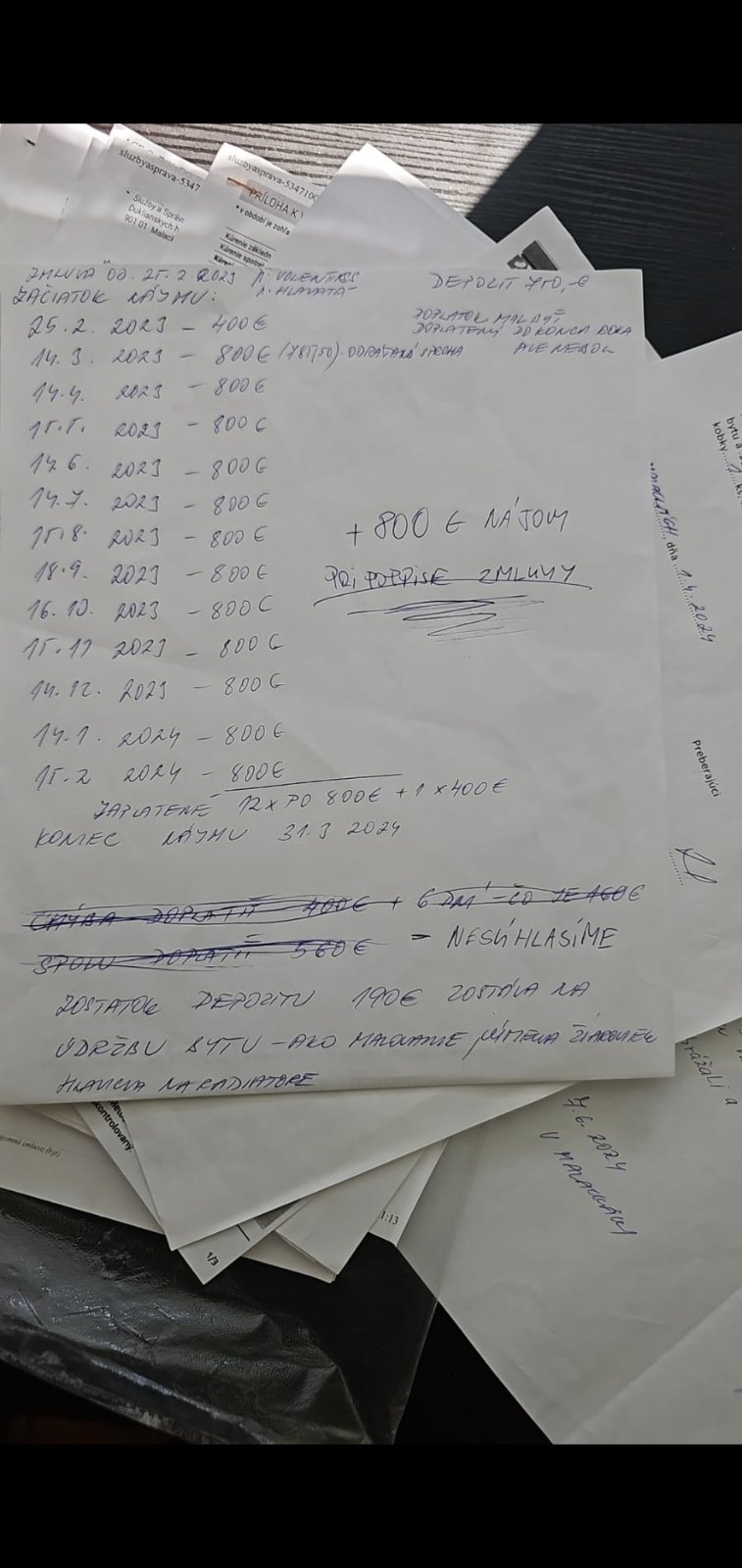 @autor mne z toho vychádza ze ste jej teda dali navyše 1150 eur. To je: 750 eur depozit podľa zmluvy plus 400 eur za neviem co, ktoré v zmluve nie sú uvedené. Nejaký iný doklad o tom neviem ci mate. Aši nie. Ale na tom papieri ručne písaním to uvedené je. Druhú časť energie sa mi teraz nedá rátať momentálne. A ešte par dni tam lieta hore dole..od 25.2.do 28.2.2023. Tie uhradené neboli. Jedine ak by tých 400 eur použila na zaplatenie týchto par dni.