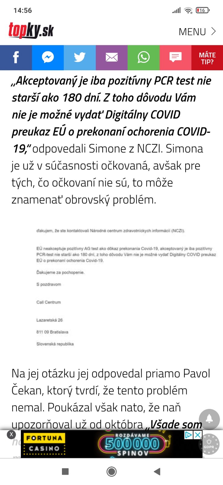 @lenkassk dobrý deň. Môj problém sa vyriešil tak, že som si včera prečítala článok, kde sa píše, že pozitívni z antigenových testov jednoducho nemajú nárok na covid pass. Iba tí, ktorí boli testovaní PCR testami. Takže som sa len nasr_la. A ja žiadny covid pass na základe prekonania nedostanem.