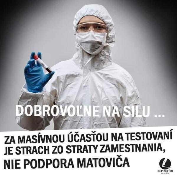 Ja na testy chodim - nevyjadrujem tym podporu Matovicovi, neobavam sa straty zamestnania (pracujem z domu), do obchodu test nepotrebujem. Chodim kvoli tomu aby som sa mohla preukazat pri pripadnej kontrole (v ramci vynimiek) a kvoli sebe, aby som vedela ci neohrozim rodicov (v ramci nevyhnutnej starostlivosti o blizku osobu). Viem, ze tie testy ma nemusia zachytit, ale nevnimam to tak, ze som na 100% negativna, opatrenia dodrziavam.