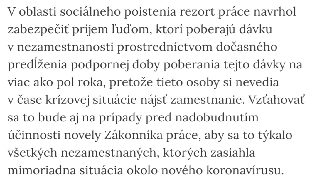 Vláda Slovenskej republiky bude môcť v prípade potreby, napríklad v prípade pretrvávajúceho nepriaznivého vývoja na trhu práce z dôvodu výrazného predĺženia krízovej situácie, môcť upraviť podmienky nároku na dávku v nezamestnanosti (vrátane predĺženia podporného obdobia) nariadením ...všetko je v riešení