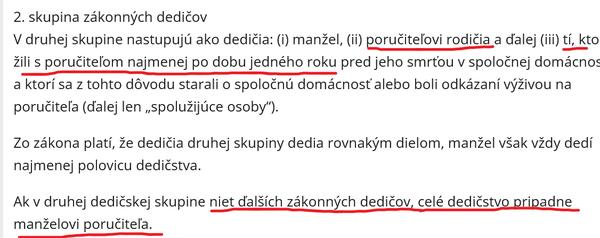 Ak však poručiteľ nemal potomka a mal manžela, nastupuje druhá zákonná skupina dedičov.