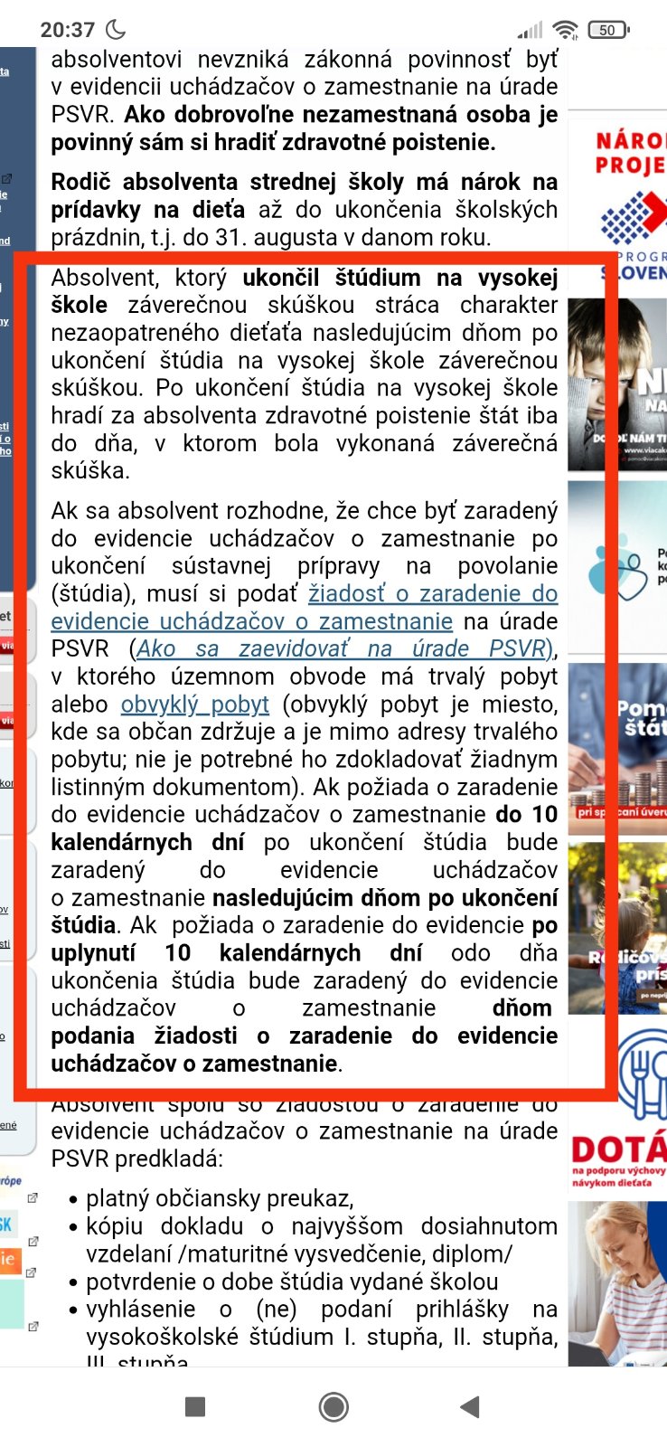 Zdravim, v piatok som ukončila Bc. štúdium, plánujem pokračovať na Mgr. a v júni mám prijímacie skúšky. Bola som sa zaevidovať na úrad práce v meste môjho bydliska,(Trenčín), aby som nemusela platiť poistenie. Poslali ma odtiaľ preč, že sa mám zaregistrovať do Trnavy, kde kvôli štúdiu bývam, pretože tam vraj budem musieť často chodiť, budú ma zapájať do projektov a pod... Z evidencie sa môžem vraj vyradiť až po zápise. Máte podobnú skúsenosť? Určite nebudem popri štúdiu stíhať prácu na TPP, brigádu si hľadám, ale momentálne sa sústreďujem na prijímačky. Prečo by sa mi mali popri prípadnej brigáde snažiť hľadať prácu... Ako by ste to riešili