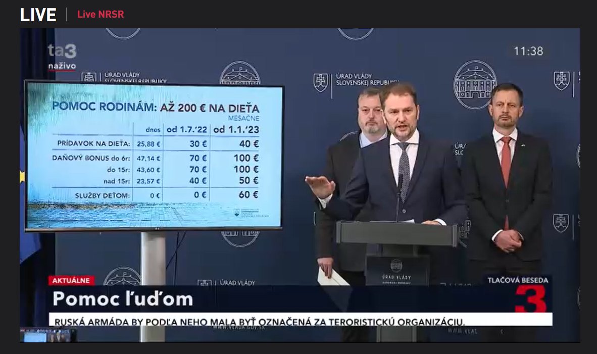 Prídavok na dieťa jednorazovo zvýši zo súčasných 25,88 eura na 100 eur. Na tento účel vláda vynaloží 83 miliónov eur. Prídavok sa zvýši pre 661-tisíc rodičov, ktorí majú 1,1 milióna nezaopatrených detí. Týkať sa bude všetkých nezaopatrených detí bez ohraničenia veku, rodiny v hmotnej núdzi, seniori, ktorým nevznikol nárok na starobný dôchodok, opatrovatelia, osobní asistenti a náhradní rodičia. Prídavok dostanú rodičia na nezaopatrené deti v júli tohto roka.
