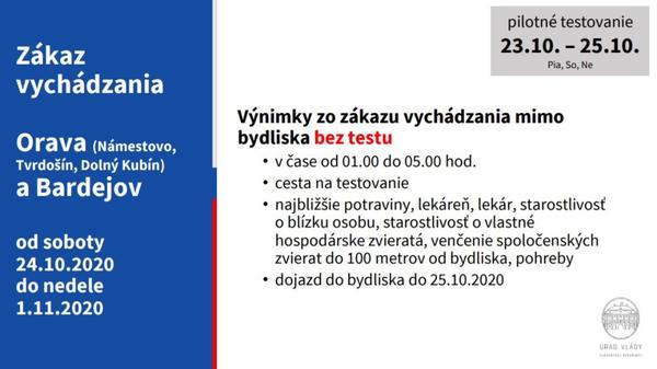 A.1. podľa čl. 5 ods. 3 písm. g) ústavného zákona č. 227/2002 Z. z. o bezpečnosti štátu v čase vojny, vojnového stavu, výnimočného stavu a núdzového stavu v znení neskorších predpisov v územných obvodoch okresov Námestovo, Tvrdošín, Dolný Kubín a Bardejov slobodu pohybu a pobytu zákazom vychádzania od 24. októbra 2020 do 1. novembra 2020 v čase od 05.00 hod. do 01.00 hod. nasledujúceho dňa, toto obmedzenie sa nevzťahuje na:
