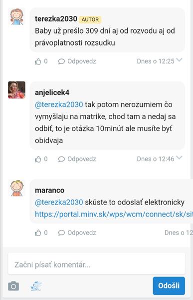 Ahojte žienky mám otázku som rozvedená s priateľom čakáme bábätko od rozvodu už 300 dní prešlo každú chvíľu mám termín tak sme išli na matriku nahlásiť otcovstvo aby som nemusela potom chodiť a tam nám povedali že sa to nedá že až po pôrode že dieťa bude mať automaticky meno bývalého a po pôrode možné prísť nahlásiť meno otca ako to v skutočnosti je pretože čítali sme že sa to sa ak uplynie 300 dní od rozvodu máte niektorá skúsenosti ?