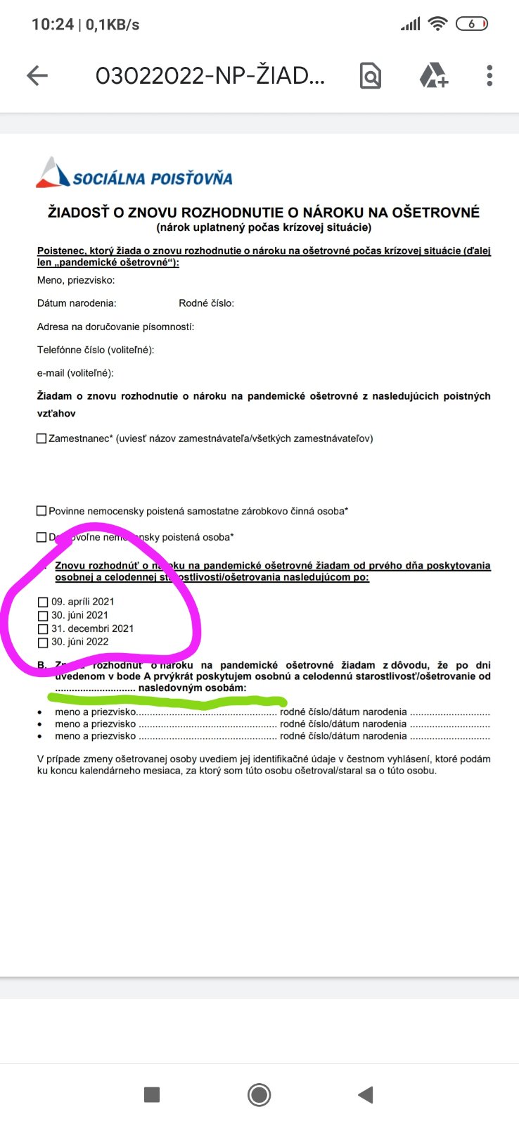 Chcem sa len spýtať, v tom fialovom krúžku mám zaškrtnúť december 2021 a do tej zelenej čiary napísať dátum odkedy som bola na prvej OČR v apríli 2022? Za apríl mi ešte nič neprišlo a bola som aj na druhej OČR teraz v máji. Mám tam dať ten apríl keď to už asi majú spracované a príde mi to v druhom vyplatnom termíne alebo ten máj čo mám fialový papier ešte doma a ešte to len budem posielať zamestnávateľovi ?