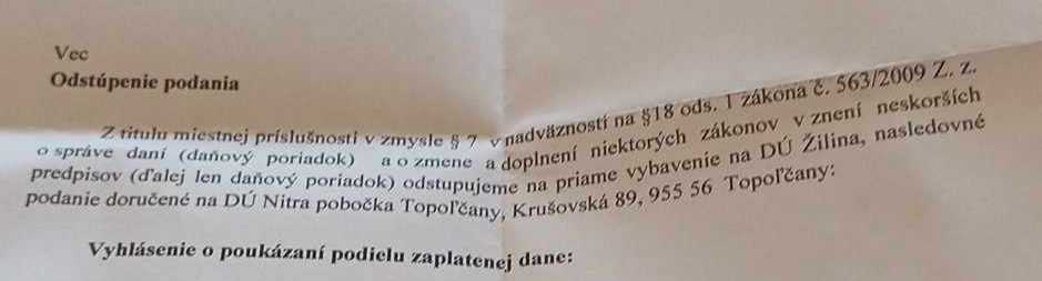@simca115 odstupuju Vyhlasenie o poukazani podielu zaplatenej dane... mne z toho vychadza ze si niekomu poukazala 2% z dane ale neposlala si to na miestne prislusny danovy urad (podla trvaleho bydliska) a preto to odstupuju na danovy urad kam patris podla trvaleho bydliska resp. podla bydliska ktore oni eviduju ako trvale.