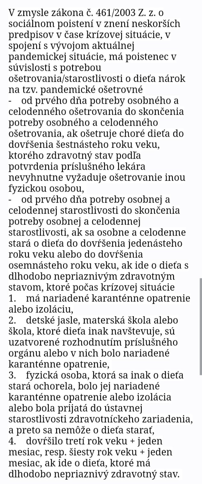 @mamina7070 nepriaznivy zdravotny stav sa tyka dietata od 6 rokov , pre dieta ktore ma 3 roky a 1 mesiac a nie je v skolke umiestnene v skolke zostava pandemicka OCR, akurat je tam podmienka ze dieta ma 3 roky a 1 mesiac. Dnes mi tak odpisali zo socialnej poistovne : V súčasnosti, počas trvania krízovej situácie (ktorá zatiaľ stále trvá), nárok na tzv. pandemické ošetrovné z dôvodu neprijatia dieťaťa do materskej školy si môže poistenec uplatniť v súvislosti so starostlivosťou o dieťa, ktoré počas krízovej situácie dovŕšilo tretí rok a jeden mesiac (resp. šiesty rok veku a jeden mesiac, ak ide o dieťa s dlhodobo nepriaznivým zdravotným stavom).