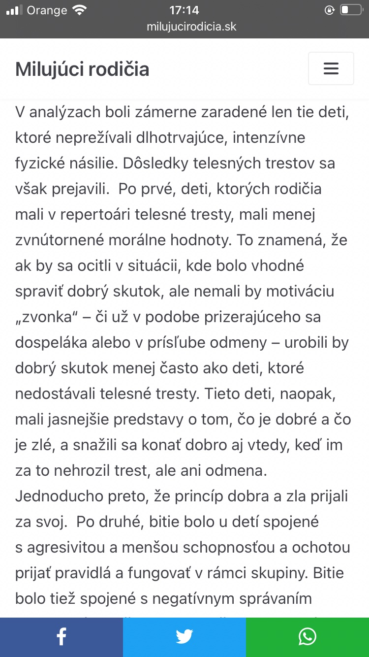 @mirkasmile úžasné, robíš závery na základe správania sa dvoch detí, ako keby si mala urobený prieskum s 20000 rodičmi a ich deťmi. Čo je na tom zlé, keď dostane po zadku? A čo je na tom dobré? Učiť dieťa, že sa iného nesmie udrieť tým, že ho udrieš tiež, je presne to isté, ako vysvetľovať mu, aké je fajčenie škodlivé s cigaretou v ústach. Ide o dieťa, ktoré sa po svete ešte len rozhliada, svoj nesúhlas, nespokojnosť, odmietanie nevie vyjadriť ináč, tak ho vyjadruje takto. Syna som nikdy neudrela, je dospelý, nebil nás, nepľul na nás, v škole s ním problémy neboli, nebol ani trestne stíhaný. Moji rodičia ma tiež nikdy neudreli a aj bez toho som vedela, čo je to úcta k rodičom.