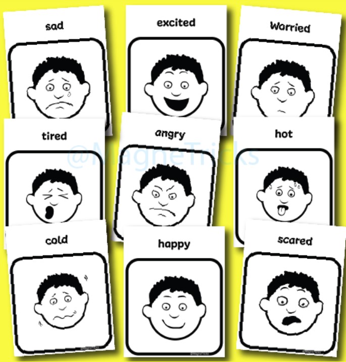Uzitocne je tiez mat graf ktory pomoze definovat emocie v tom ktorom momente a co pomoze na ich spracovanie. Napriklad mat emocie oznacene podla farieb, alebo trenovat s dietatom aby vedelo pomenovat emociu tak ze mu ukazujeme tvare ludi v roznych emociach.