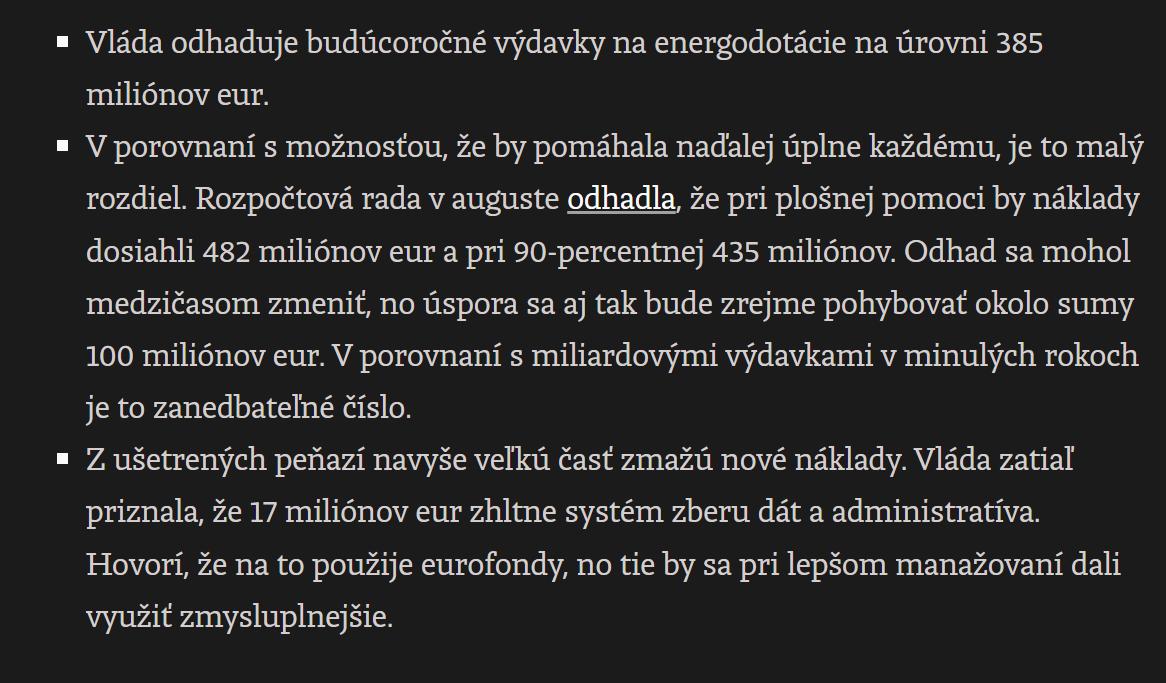 @aalt balik na energopomoc sa mal minut uplne inac. Podporou setrenia energiami, teda dotaciami na zateplovanie, na fotovoltaicke systemy pre rodinne a bytove domy, na tepelne cerpadla... Takto su to peniaze, ktore sa iba a len "prezeru", ale zas na druhu stranu prezieranie penazi je typickym "riesenim" tejto akoze socialnej a akoze demokratickej vlady.