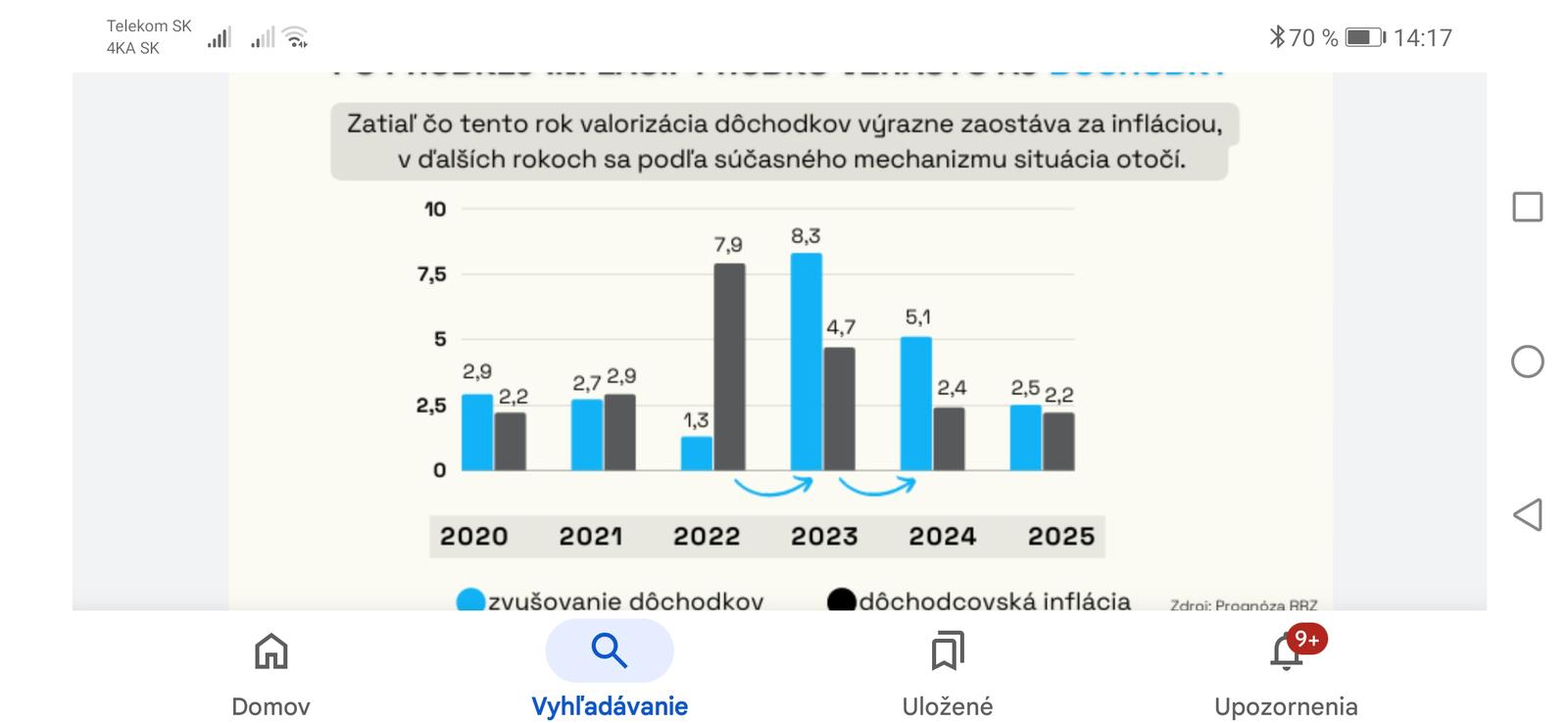 @bielasovicka a ty vieš, že výška valorizacie dôchodkov závisí od výšky inflácie? Čím vyššia inflácia tým vyššie dôchodky tým vyššie ceny. A ze tento automat je tu máš nastavený dlho, len počas predošlej vlády došlo k zmene aby dôchodcovia netrpeli nárastom cien a tak sa prijala novela, ktorá určila ze pri extrémnej inflácii sa môže ta zohľadniť a dôchodok sa môže valorizovat aj viac krát za rok. Všimni si v grafe infláciu v roku 2022 a % valorizacie dôchodku.