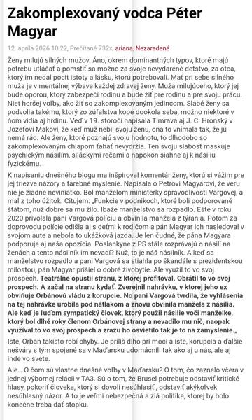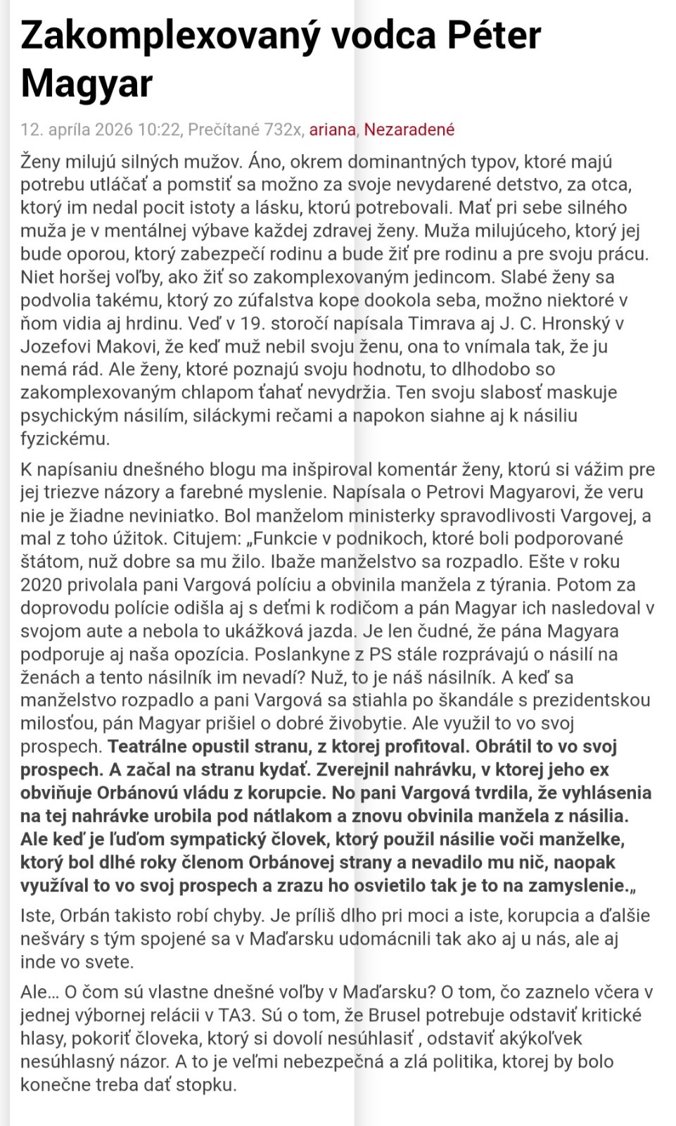 @anonym_5c1983 ty musíš byť velmi frustrovana ze si oni zvolili Magyara. V tom článku je polovica len pravda. Kto je ariana? Napise blog o človeku ktorý ako ze začal žiť od roku 2020. Je zaujímavé porovnanie Orbana s korupciou. No síce je, ale nevadi ved aj inde je. No štatistiky uvádzajú ze v Maďarsku je korupcia najvyššia a ďalšia vec chudoba? Minimálna mzda? No asi tak. Po 16 rokoch tu hádzať vinu na iných a on je baránok je veľmi milne. Veľmi ťažko sa vyrovnavas prehrou Orbana. Je to demokracia ľudia si vybrali "nasilnika"