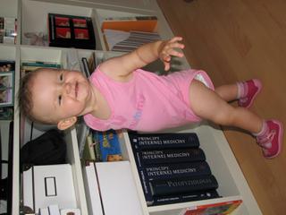 Bibka, krasne foto. Arret, nerob si tazku hlavu, pozri moja po motorickej stranke...no co uz,kazde dieta je sikovnejsie v inej oblasti. On sa to nauci. Ja som mojej vzdy spievala, ukazovala, tancovala s nou...ako taky papagaj som robila vsetko dookola...alebo neskusala si ukazat na babike? U nas to zabera, uz vie ukazat oko, vie kde da babike papat a kde ma nostek. Skus s babike ukazat tapusky, viem je chlapec, ale co uz,..a dedo ju naucil piskat, tak stale spuli pusu a skusa, je to zlate. Dnes sme mali super pad na hlavu. Postavila sa ku prutenemu kreslu a stiahla ho na seba, nepadala na ritku ako vzdy,ale rovno na hlavu,pritom som vcera drhla koberec,ktory sa momentalne susi, cize padla na podlahu...no placu bolo neurekom.