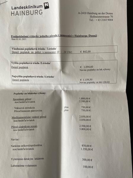 @gartija kontrola cize ctg a ultrazvuk 272€ a Den v nemocnici 842€ x 4 dni= 3368 ale platila som 3600 len faktura mi este neprisla ta mi dojde postou kazdym dnom tak neviem co tam vsetko uctovali este plus k tomu . Minule porody mi union preplatila 25% tento porod som este nedavala ziadost nemam este vsetky papiere .