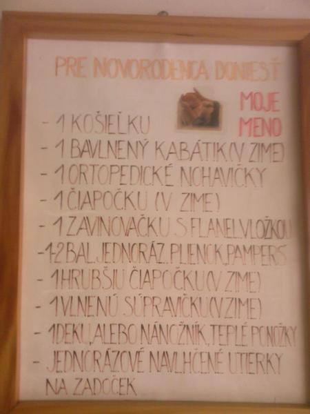Prikladam este jeden zoznam, ktory som nasla v ambulancii v monobloku na CTG 🙂 z nich potrebujes vlastne vsetko, ale este by som ti odporucala jednorazove nohavicky pre seba (tiez kupis v zdrav.potrebach za par centov - su velmi pohodlne, bavlnene a daju sa preprat), no a ak chces a mas, vezmi so sebou vlastnu odsavacku ;)