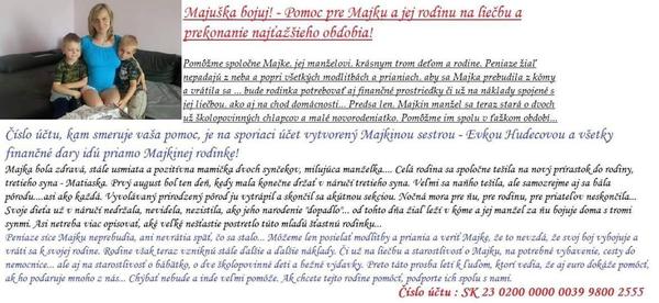 Ešte v čase, keď Majka bojovala o svoj život, jej sestra založila SPORIACI ÚČET, cez ktorý môžete pomôcť a trošku uľahčiť ťažkú situáciu pozostalej rodine. Pomôžme im spolu v tomto pre nich bolestnom a ťažkom období.
