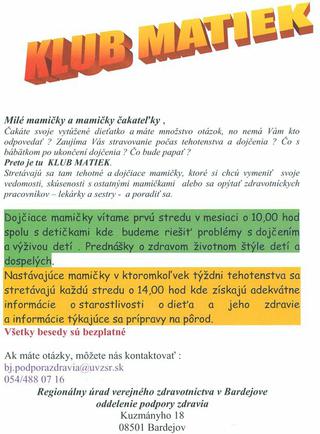 ahojte maminy....pozyvam vas na stretka,ktore sa konaju kazdu stredu o 10:00 na Hygiene- budova Farmacolu...buduci tyzden zial z organizacnych dovodov museli presunut stretko na stvrtok! snad sa tam uvidime, pripravte si otazky, na vsetko dostanete skvele odpovede... tiez sa tam konaju aj stretka pre nastavajuce mamicky..vid letacik,cmuk
