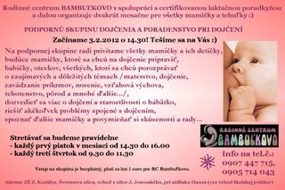 Ahoj, mamicky 🙂 idem Vam dat do pozornosti Rodinne centrum Bambulkovo a jeho novy projekt- pripravu na dojcenie pre tehotne a podpornu skupinu dojciacich mamiciek, je to bezplatne 🙂 robi to certifikovana laktacna poradkyna a dula v jednej osobe, keby ste mali zaujem aj o pripravu na porod, piste mi IP a ja Vam to taktiez bezplatne dohodnem 🙂 na podpornu skupinu chodia mamicky s detickami, ked sa chcu dozvediet cokolvek viac o dojceni, materstve, porode, tehotenstve, dietatku a jeho vyvoji, prikrmoch...riesit nejake problemy s dojcenim, starostlivostou o dietatko, bolave prsniky, malo/vela mliecka, hocico a dostat odbornu radu a pomoc 🙂 ak mate akekolvek otazky, pytajte sa, bud IP alebo aj mailom na morningstar@centrum.sk. Prve stretnutie bude 3.2. o 14.30