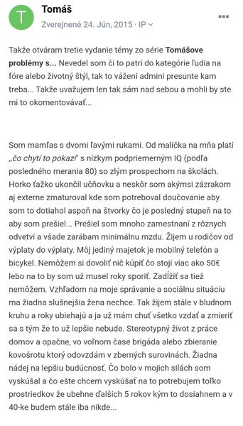 Ludé očúvajte sem šecci velkú vec vám povím tag očúvajte. Ondíte bárjako namjá, ale ovela lepšie situovaní ludé (bárjakí dlhodobo zamestnaní, živnostníci, podnikatelia) majú napríklad niekolkotisícové dlhy na odvodoch, hlavne v zdravotnej poisťovni. A já chudák bez majetku, párcentový človek čo prežíva ze dna na dzen, som nikdy nemal taký dlh v zdravotnej poisťovni, alebo voci hocijakým iným inštitúciám. Vždy som všetko vrátil, splatil, aj tie prúsery keď na mne podvodníci koňovali, sa splatil, nikdy ma nenaháňali exekútori, kolko odomňa lepšie situovaným chodia upomienky za nezaplatenie účtu operátorovi atď. Aj tak to musíte vidzet, né len vyhadzuvat mi na oči že hento a tamto. Já som ešte velmi dobre na tem oproci volakerým. Já som nikemu neublížil, tak prečo tak namjá vyprávjáte?