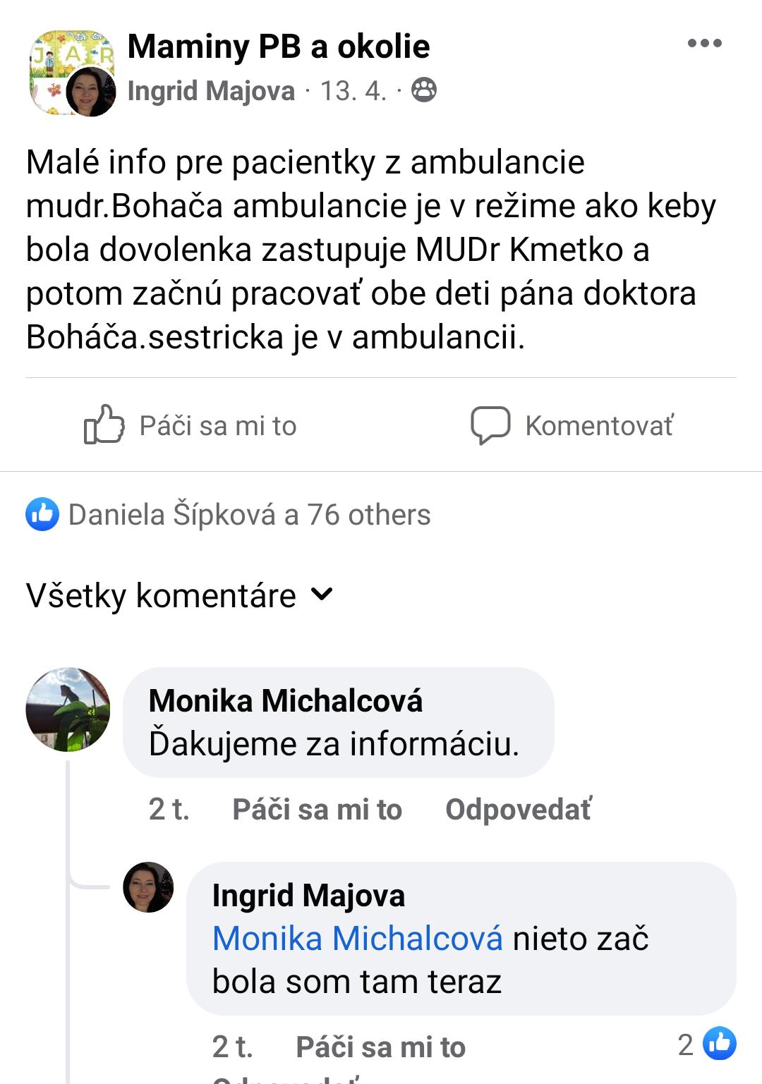 @veronika_liska ahoj, Dr Zboranová, ktorá má ambulanciu po Dr. Boháčovi, má 17.7-31.7. dovolenku a zastupuje ju Dr. Kmeťko, takže by mal ordinovať. 🙂 Inak väčšinou majú dovolenku a zástup zverejnené aj tu: https://www.tsk.sk/zdravotnictvo/ambulantne-zdr...