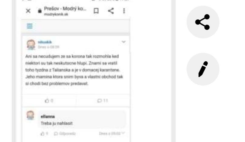 Hľadám autorku tejto správy. Koronavírus tu besnie, a nejaká pani s pozitívnou anamnézou, jej syn je v karanténe po návrate z Talianska v spoločnej domácnosti s ňou, a ona chodí ďalej do obchodu predávať. Je to príspevok nikuskik. Prosím ozvite sa, musíme to nahlásiť, veď pól Prešova nakazí. Je potrebné ju nájsť, pre naše zdravie aj našich detí. Prosím ozvite sa, aj súkromne na pistina2904@gmail.com. Vďaka.