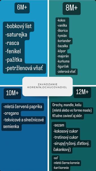 @evickuska bylinky mozes davat od pol roka (s mierou), nasledne pridat aj ostatne koreniny. Sol nie je potrebne pouzivat vobec, iba my sme uz na to zvyknuti ale dieta sol nepotrebuje. Je jej dost v potravinach (sunka, syr aj obyc pecivo) no a cukor….neplanujem do troch rokov vobec sladit. Nehovorim ze si nesmie dat kolac u babky ale ked chystam ja snazim sa sladit napr bananom, pripadne robim taky kolac kde docielim chut ovocim.